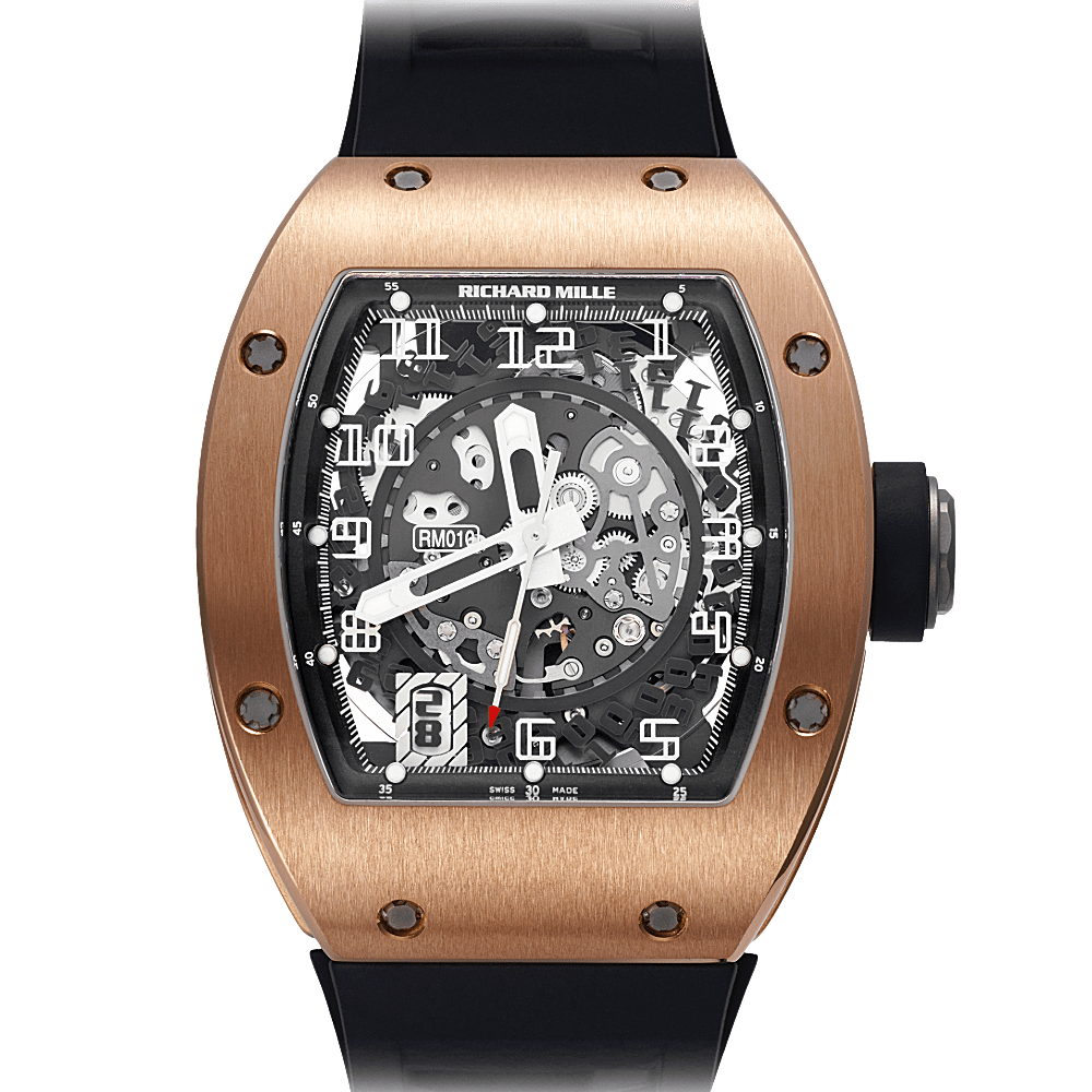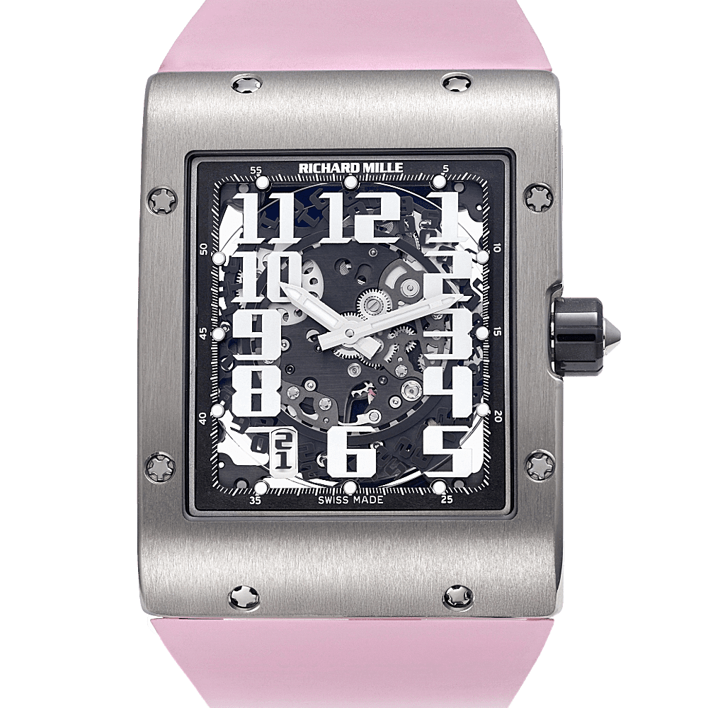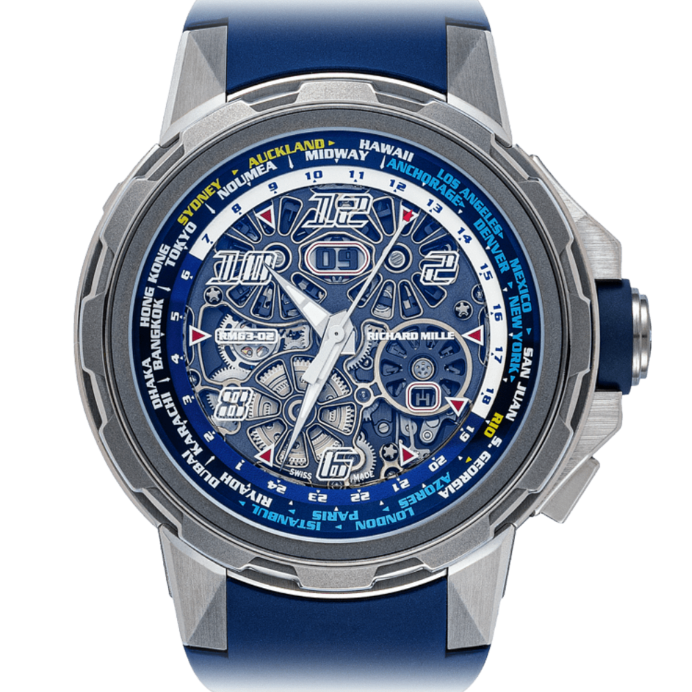 Released in 2002, the RM 003-V1 is almost similar in design and layout to the RM 002, the RM 003 however differs with the addition of a second time zone disk at its center, technically extremely complex but also very user-friendly. This dual time zone is easily and quickly adjusted using the handsomely finished pusher situated at 9 o’clock. Each press adds an extra hour to the time zone. The digits on the disc are apparent only when seen against the white bacakground situated at 3 o’clock.